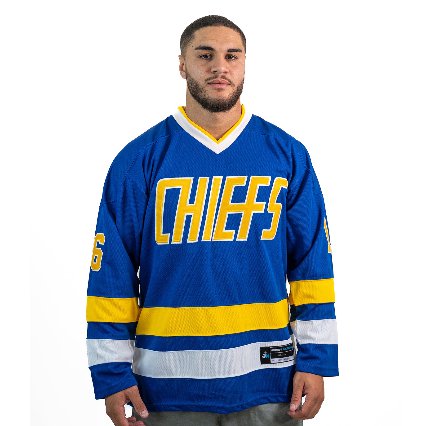 Combine your love of sports, streetwear and nostalgia by copping the Charlestown Chiefs Hanson Brothers Hockey Jersey. This bold jersey features contrast panelling and striping all throughout and embroidered team logos on the sleeves and front and centre. Don't sleep on this iconic hockey jersey, available now at Jersey Nation while stock lasts!