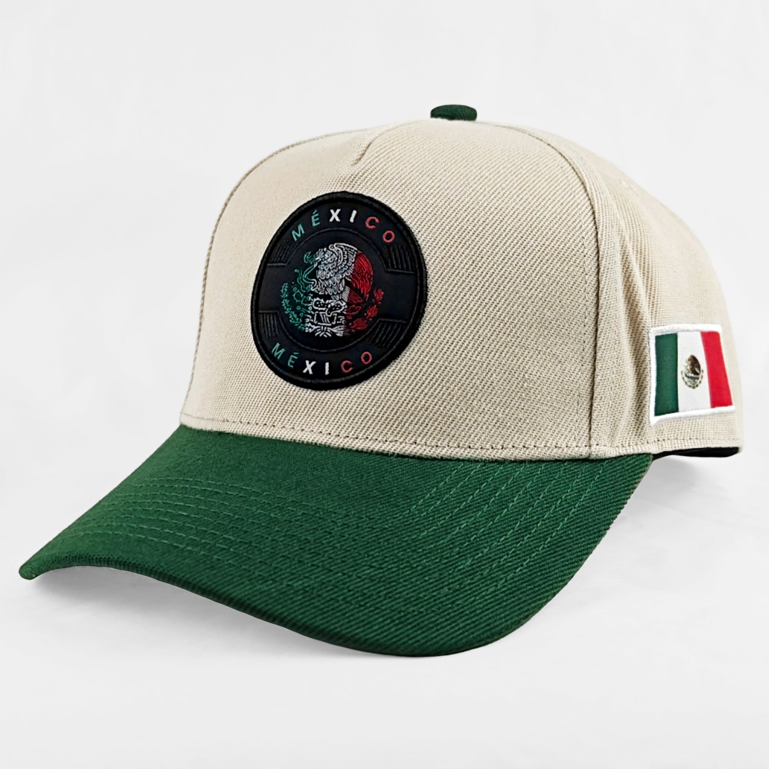 The front panel features a detailed embroidered México crest in red, white, and green, while the left side proudly displays the Mexican flag patch.
