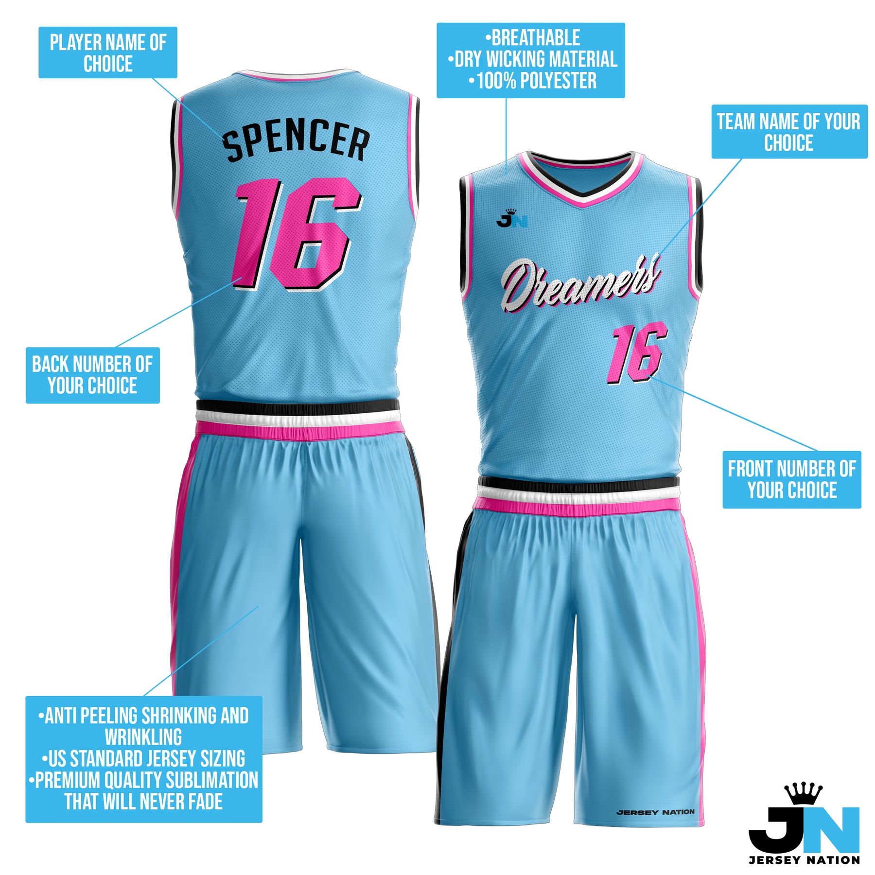 Customize your team's basketball jerseys and shorts with player names for a professional finish. Premium quality, no minimum orders, unbeatable value.