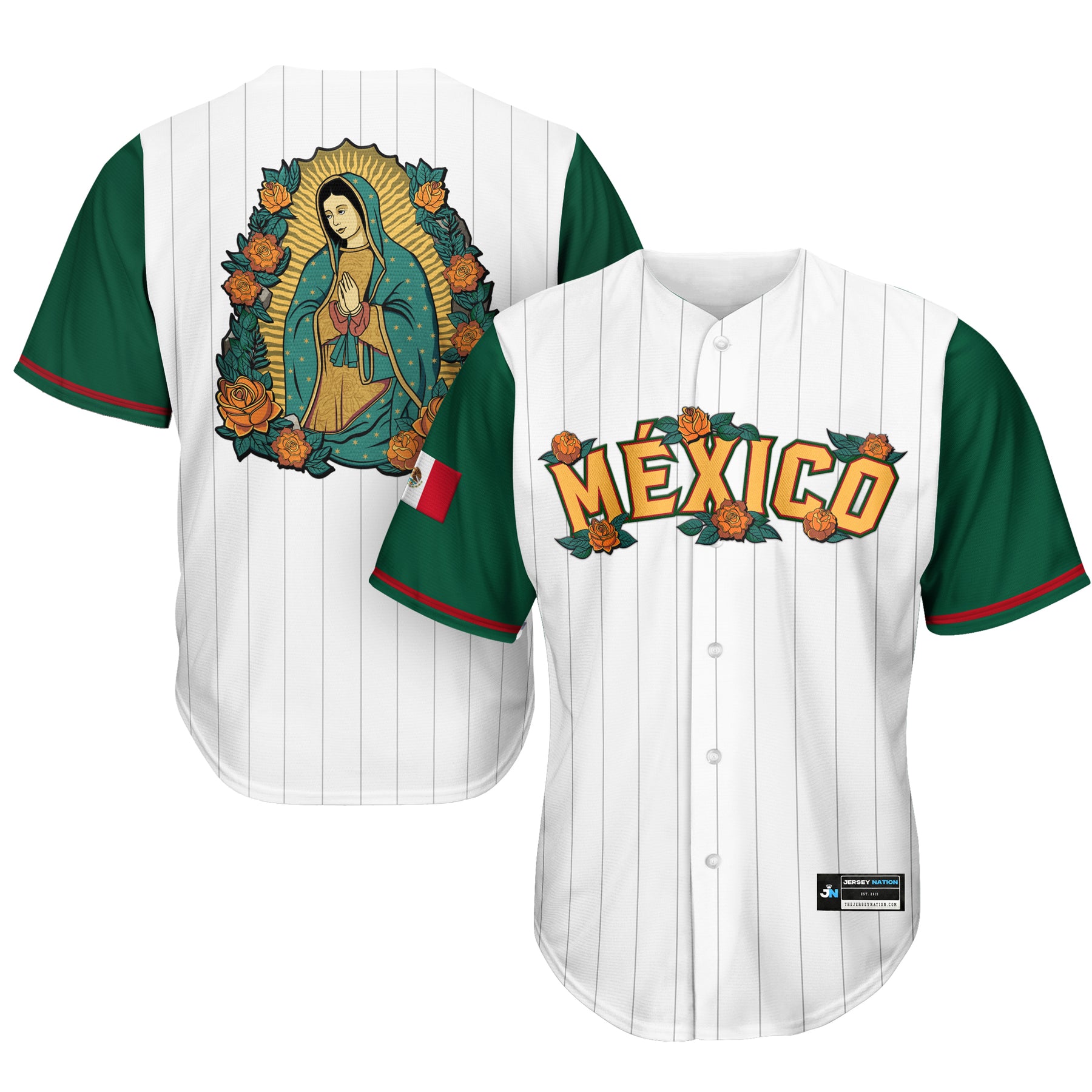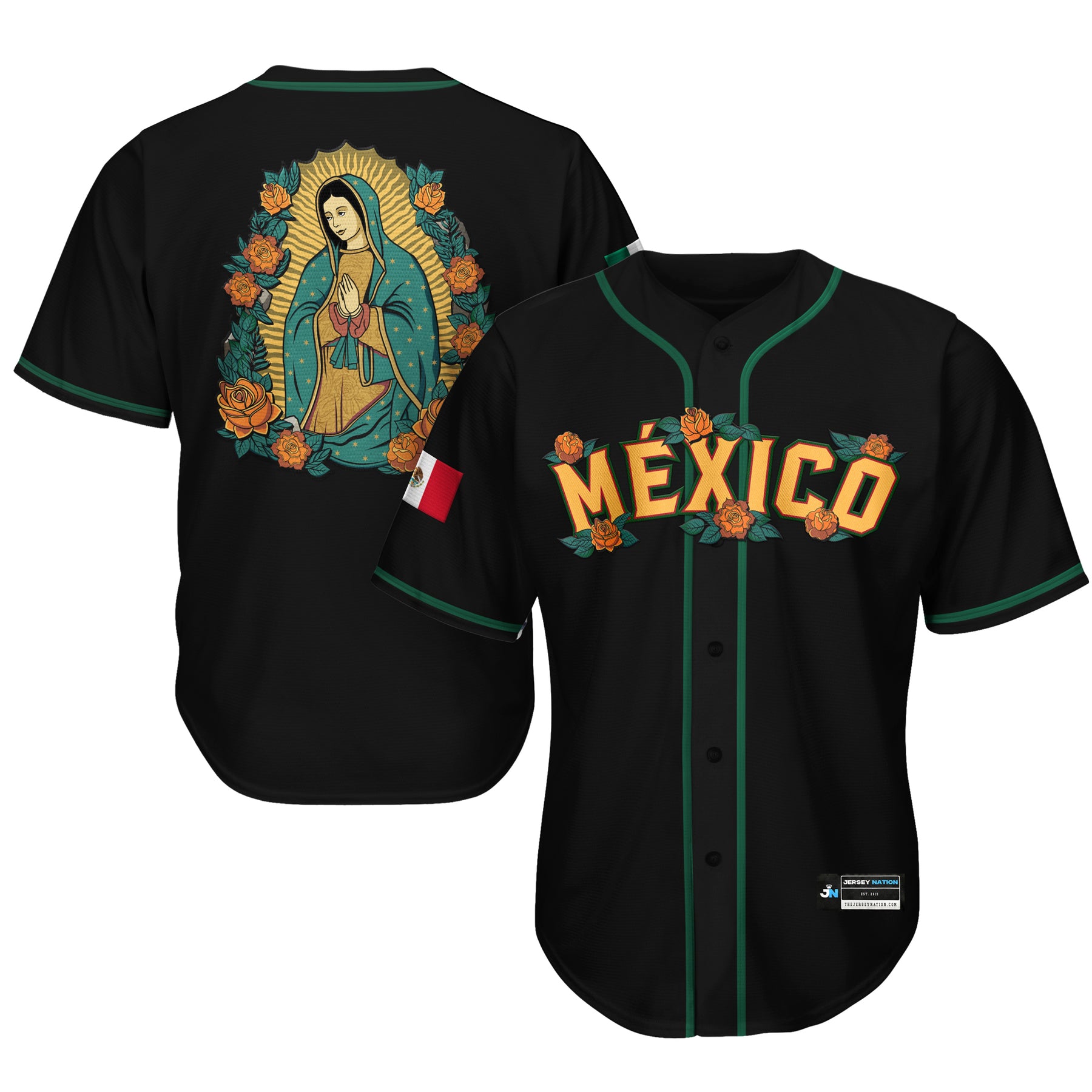 Combine your love of baseball and cultural pride by copping our Mexico Guadalupe Baseball Jersey. It infuses breathable polyester with sweat-wicking technology to help keep you cool and dry, fully sublimated graphics. Don't sleep on this unique baseball jersey, available now at Jersey Nation while stock lasts!